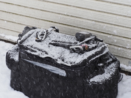 車内で耐雪装備を装着。なお、既に破れているので本運用で処分が決定している。出発したら視界が真っ白。30分前は雪がちらつく、位だったのに。