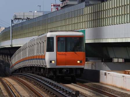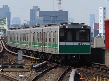 接続が大変悪い。まあ、御堂筋線の列車本数が多いのが多分原因。コスモスクエア行に乗って九条、弁天町、朝潮橋で撮影。邪魔になるものがないのは朝潮橋だけどカーブの角度がイマイチ。九条がアングル的にはいいけど阪神高速の高架が思ったより邪魔。