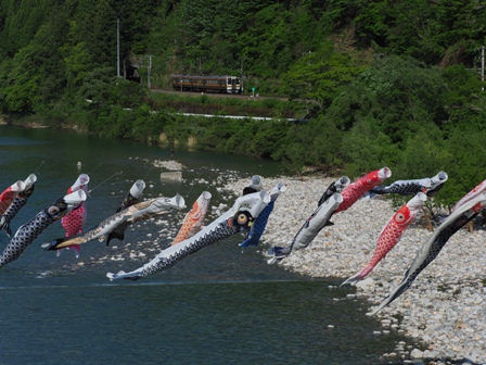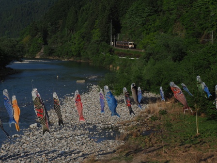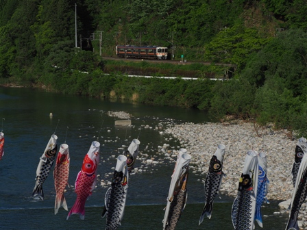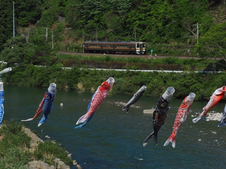 出会って3年目。鯉のぼりと飯田線。主に鯉のぼりの勝ち(逝)つか風が強いとか強い風のせいで絡まってるとかは運の問題であって駅長は悪くない(逝)