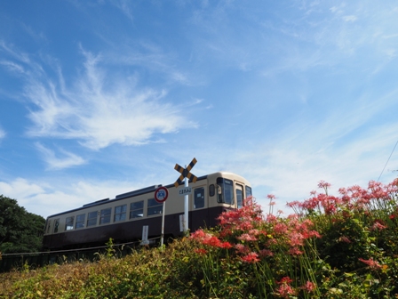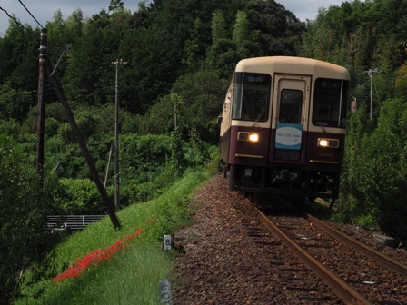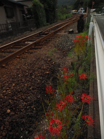 下り列車に乗って敷地へ移動する。ここの彼岸花もきれいだな。