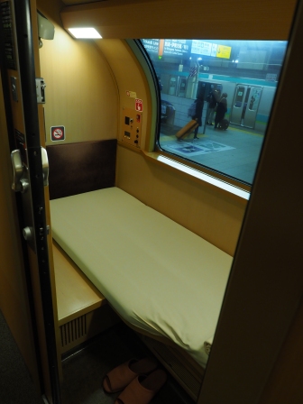 おお、ソロに比べると超広い。なにせ、部屋の中で立つことができる。リュックサックとカメラバッグをベッドと床以外の場所に置くことができる。これだけでも2000円の差額はあると思ってしまうね。着替えるのもラクラク。2200出発。