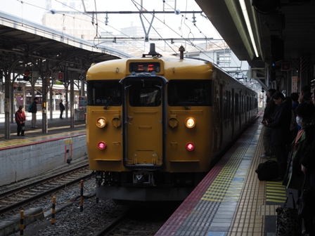 10分ほどの間に乗車位置に列ができた。やってきたのは黄色い115系だった。出発までに車内は満員になる。
