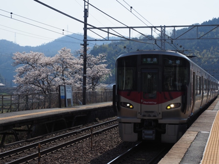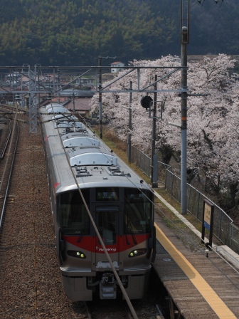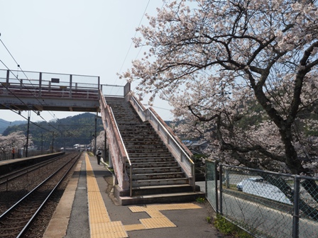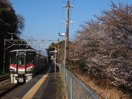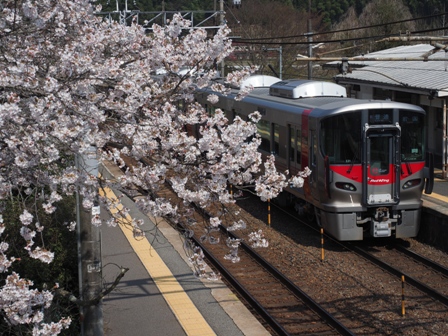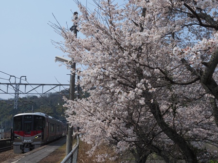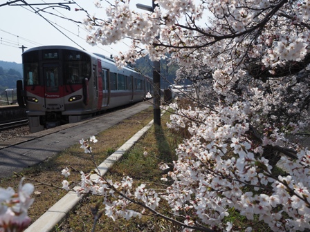 227系のワンマン列車。吉名でホームの桜に惹かれて下車。