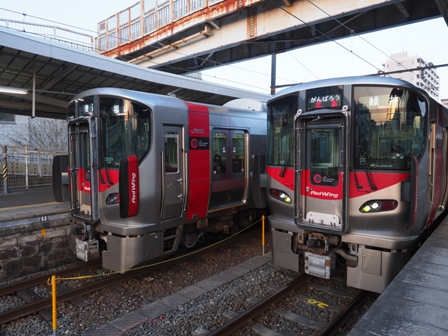 227系は広島地区にずいぶん久しぶりに投入された新車。JR 化後はもちろん初めてだ。225系をベースにしたステンレスボディの転換クロスシート車。