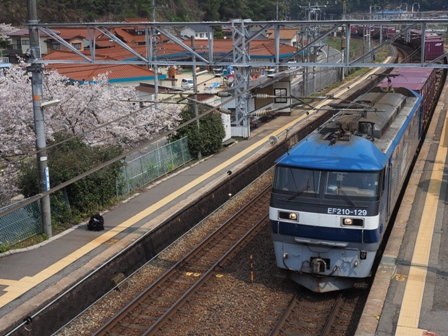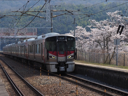ホームから見える桜が満開だ。これを絡めて撮らない手はない。