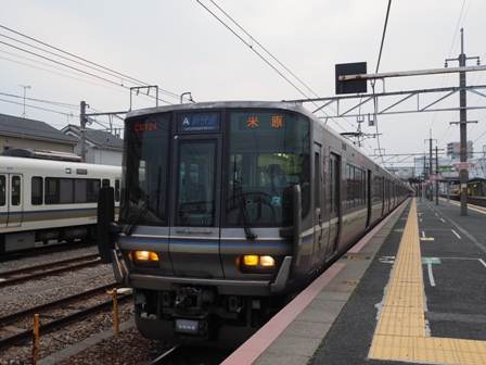 さて、3番線にゆるゆると入線してきたのは223系だった。後ろの方は違うかもだけど。先頭の12号車に陣取る。