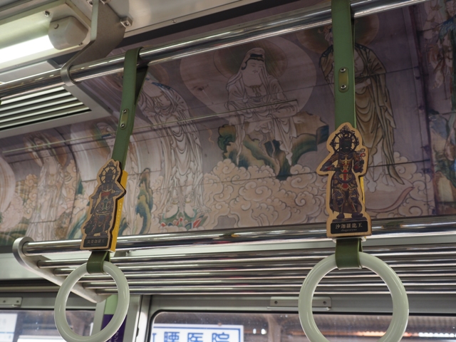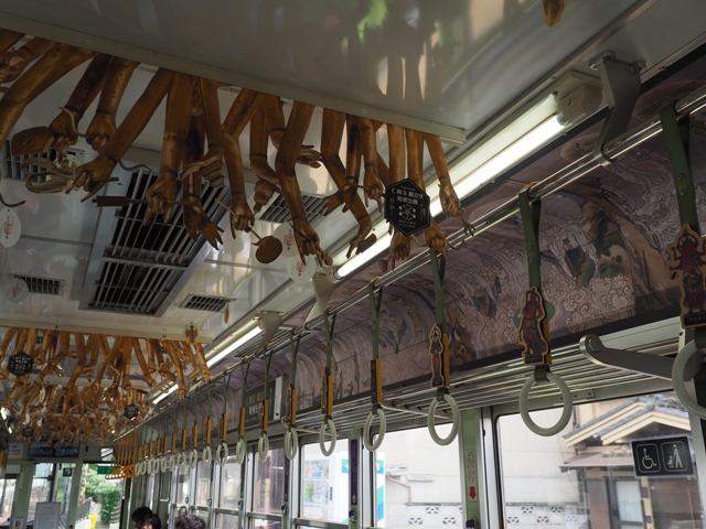 そして北野白梅町で折り返してきた観音電車に乗る。車内はありがたい仏画でいっぱい。でも天井から降りてきた手がコワイ気もする。きっとこの手が救いのためと思えない段階で地獄行きなんではないかと(逝)