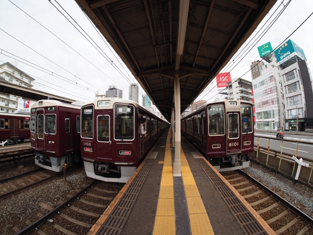 大阪梅田の駅名標とずらりと並んだ編成を記録にしよう。