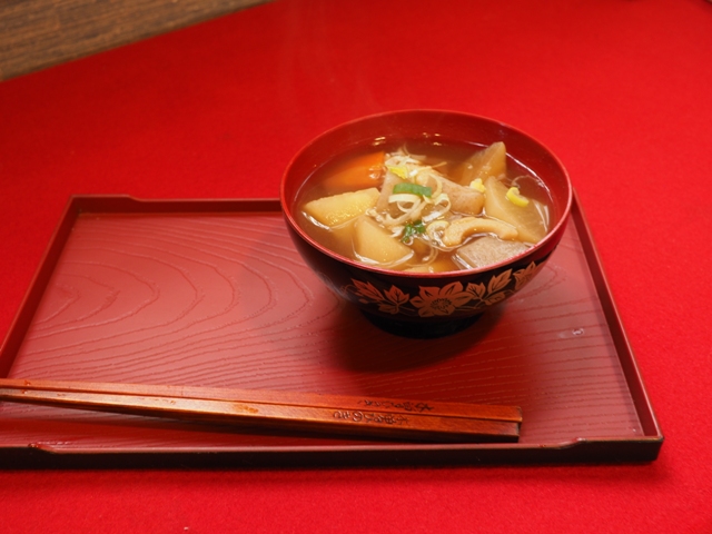芋煮をいただく。甘いおだしが美味しい。