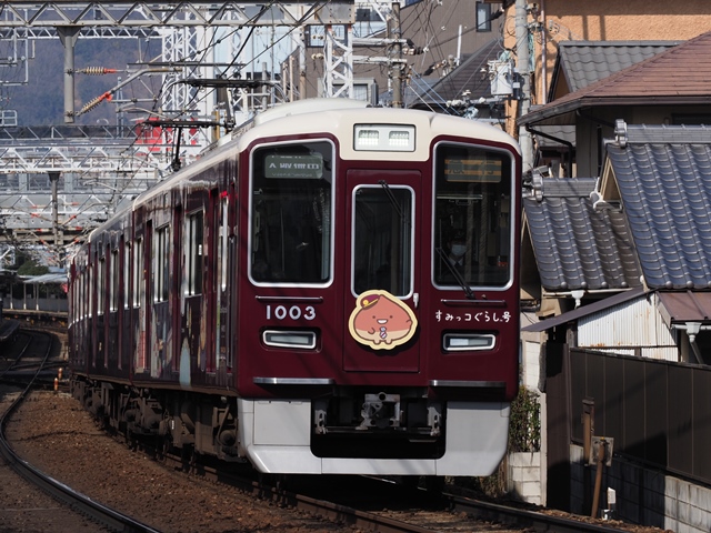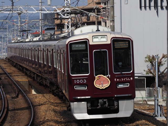 阪急とすみっコぐらしのコラボはなかなか凝っていて本線でラッピング編成を走らせるとともに各支線、つまりすみっこの路線にもヘッドマークを出している。