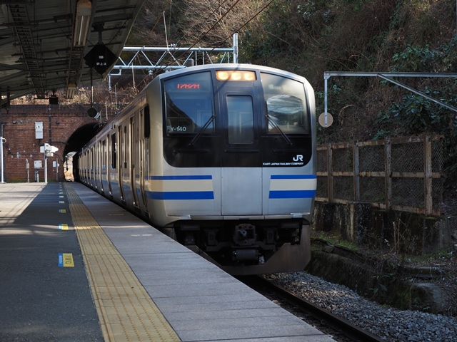 田浦は駅の前後をトンネルに挟まれている。このため11連をホームに収めることができずドアカットをしている。そのトンネルもレンガ積みでいい感じ。