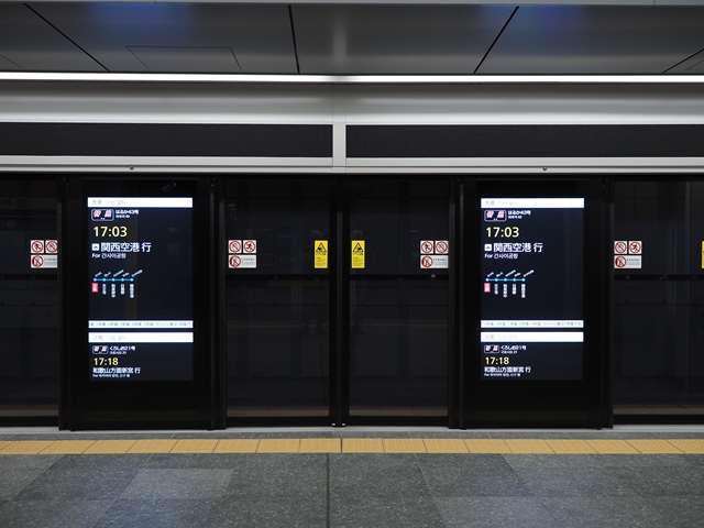 下り本線だけホームドアが設置されている。これがデジタルサイネージまで含めた高機能なもの。