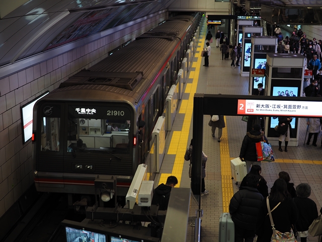 昔撮ったときはまだ御堂筋線は8連で停車中のカットが撮れたのだけど今は発車直後のカットを撮るしかないんだな。