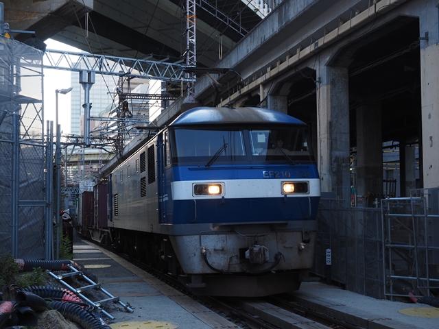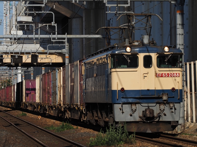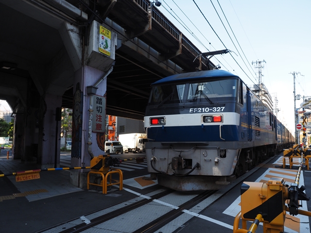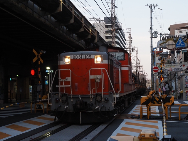 あれ、なんで安治川口方にカメラ向けてるの、と思ったら踏切が鳴動。やって来たのはDD51だー。レール輸送用の臨時じゃないか。