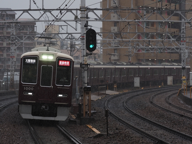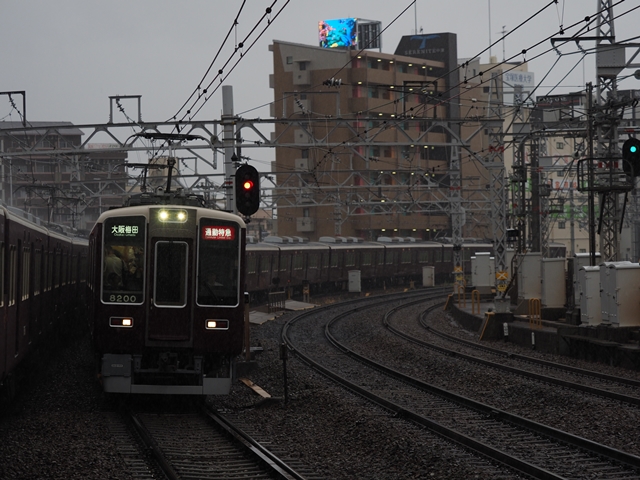 豊中通過後列車は速度を落とし、蛍池手前の右カーブで停止信号と前を走る急行が見えた。そりゃ止まるわな。