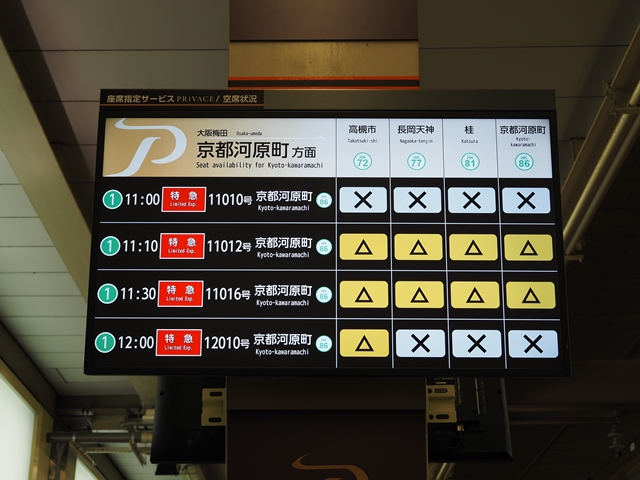 特急系の列車の停車駅にはPRiVACEの4号車付近に空席案内のディスプレイが設置された。が、大阪梅田のホームの発車案内じたいにはPRiVACEあるいは座席指定車の表示がない。ちょっと不思議。