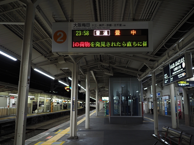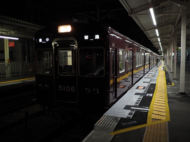 続いて箕面線最終を見送って直後にやってくる回送を撮る。到着の仕方とかは休日ダイヤのときに見たとおりなのだけどやっぱり夜は夜で見え方が違う。