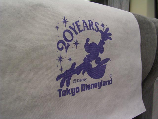 ドリームキャンペーン号といっても各車輌の側面に1〜2枚、ドア横にステッカーが貼ってあるだけでそう派手ではない。車内はといえばデッキの開き戸の窓にステッカー、それもキャラクターではなくTDL20周年記念のシンボルイラストだからそう派手ではない、が貼ってあるのと、各シートの枕カバーがミッキーマウスのシルエットになったイラストになっている、程度である。