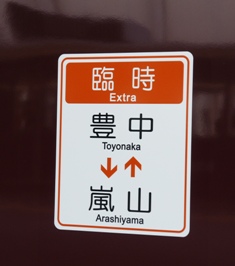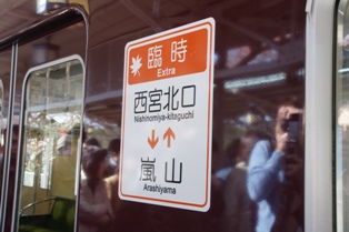 2008年の秋、突然平日に西宮北口発嵐山行の臨時列車の運転が発表されました。現在運転されている直通特急の源流はこの臨時列車にあります。当初は列車種別は臨時、行先方向幕は白幕で貫通扉にヘッドマークというか懐かしの行先方向板を掲げての運転でした。また、誤乗防止のために車内外には専用のステッカーや停車駅案内を用意する念の入れようでした。