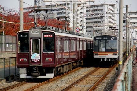 Photo:嵐山 2008/11/19この時点では十三駅9号線と呼ばれる折り返し設備が付近の道路工事の影響で使えなかったため、神戸線から中津を出たところで宝塚線にわたる立派な渡り線設備が設けられていました。