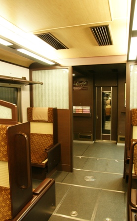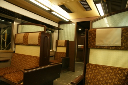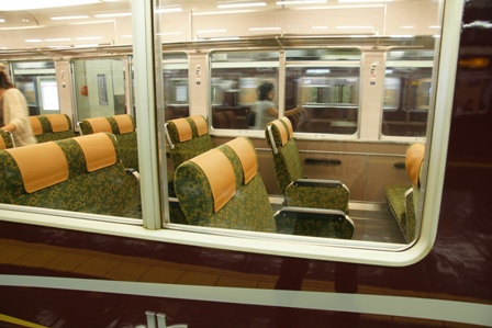 梅田方1,2号車は転換クロスシートで京唐草をモチーフに蘭の華散らしとし暖色系の2+2列のクロスシートです。配色で大幅にイメージが変わりましたが、日よけ用のよろい戸が健在であるなど、全盛期のイメージが強く残っています。また、シートのリネン部分(いや、麻じゃないのでリネンではないのだけど)は、原形の2座席まとめての横長のものから、各座席用に分割されたものにデザインが変更され、高級感が増加しています。