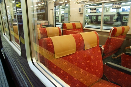 乗客の下車後いったん車内整備としてドアを閉じ ましたが、さほど長い時間でもなく再びドアが開きました。4号車の1列シート側に席を取ります。4号車は話題の町屋風インテリア車輌です。思い切って固定クロスとし、畳に座布団のイメージのシートになっています。実際に畳生地も使われてい て和の雰囲気です。1、2、5、6号車は2+2列のシートですが、3、4号車は1+2列のシート配置なので一人でもまあ気楽で すし、二人連れはそこで空気を作ることも可能ですね。固定クロスとはいえ、転換クロスシートの向かい合わせ状態よりもシートピッチが広く取ってあるので足下にも結構余裕があるのは とても良いと思います。