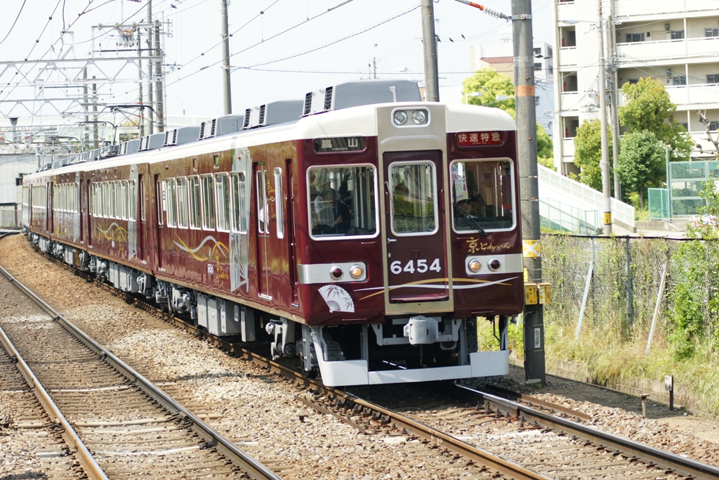 この編成が残っていれば8連の京とれいんを構成して現行ダイヤの足並みで運用することも出来たと思います。あ、そういえばトップナンバー6350Fがまだ残って ますね。ここから中間電動車2両を抜き取れば8連を組むことも出来そうです。でも、京とれいんが発着する、河原町駅2号線が7連ホームなの が最後までネックになりそうですね。新幹線と併走する大山崎で減速しました。おそらく高槻市の待避線に入る準急が前を塞ぎ、定期特急も減速させられているのだろうと推測します。高槻市ホームを全盛期のように全開で通過、と思ったらそうはならなかったのはちょっと残念 です。