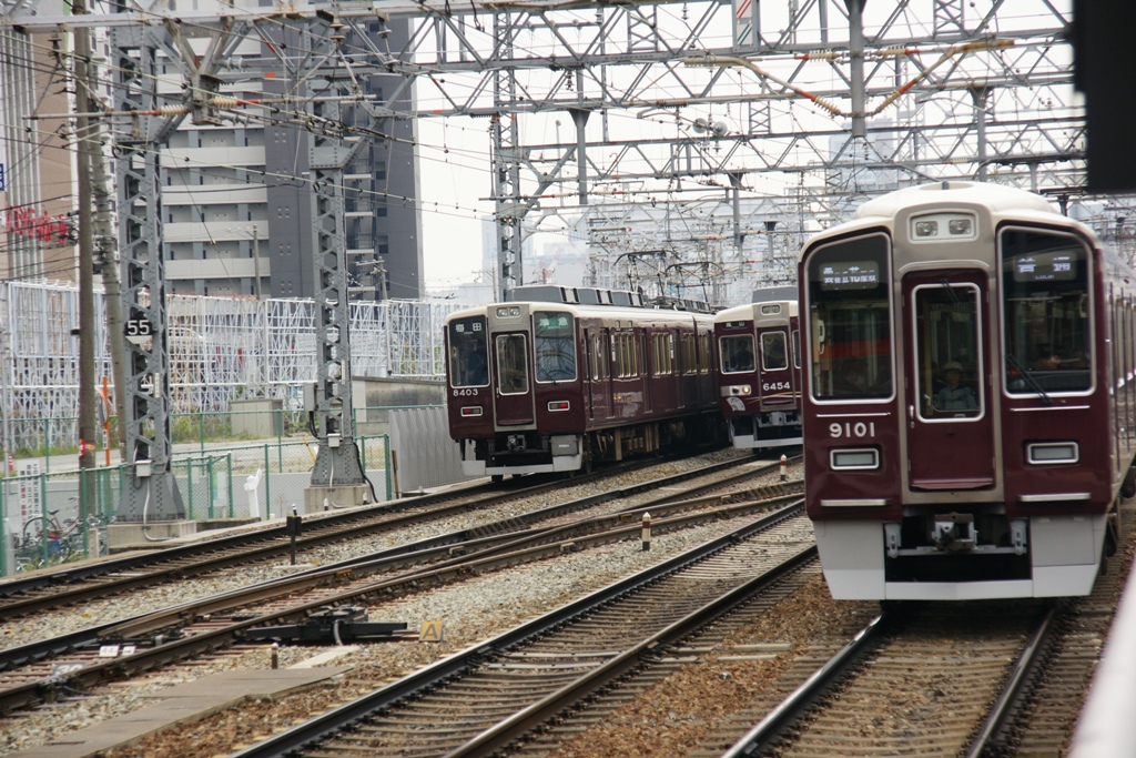 下り線に入ってすぐに進路を塞がれて入線出来ない特急とすれ違 いました。こちらも特急が前にいるので場内手前で最減速しました。烏丸での乗車はあまり多くありませんでした。これは定期特急が前にい ること、昼過ぎであること、さらに快速特急が通過する長岡天神や高槻市への客も結構いるって事が総合的に影響しているのでしょう。