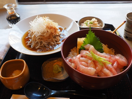 腹減った。何かないかな、と見回したらあったぞ越前蟹の坊。海鮮もそばもあるというならいいだろう。というわけでおろしそば膳と甘えび漬け丼。1950円は安くないけどこんな甘えび初めて食べたよ。うまかった。